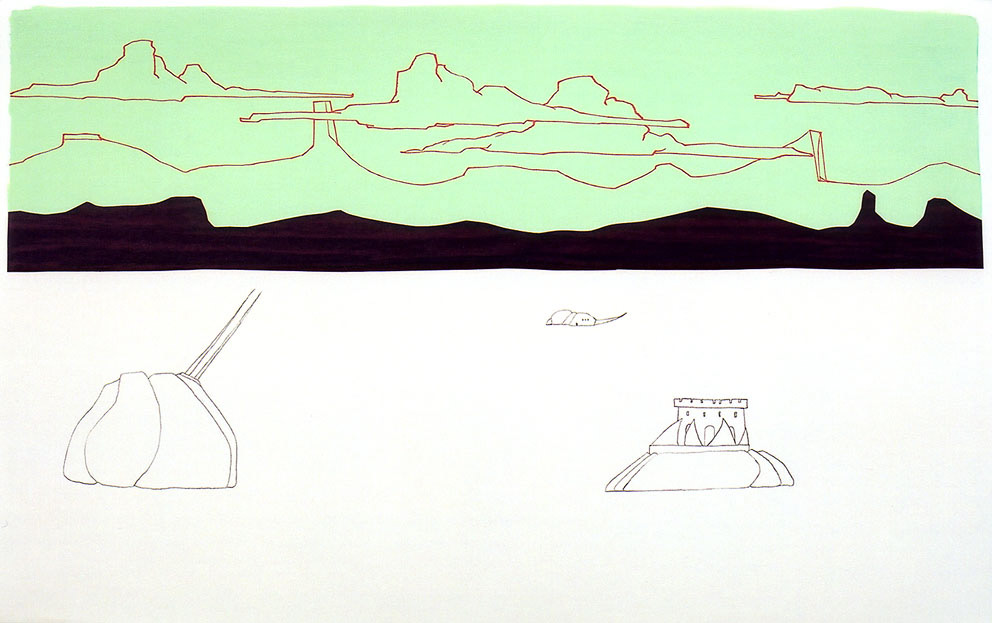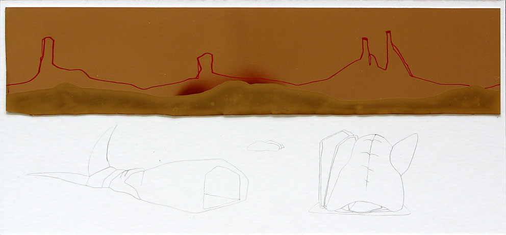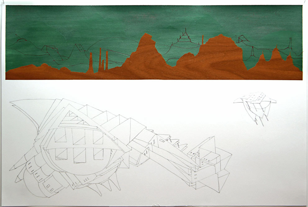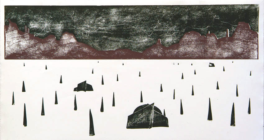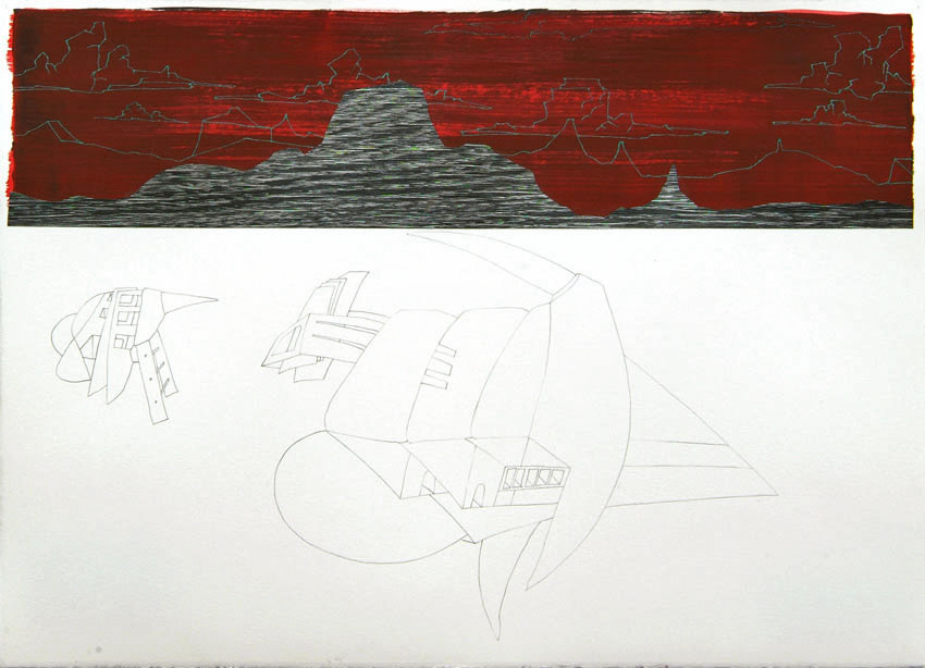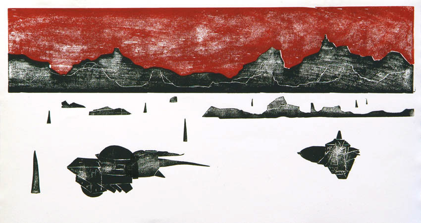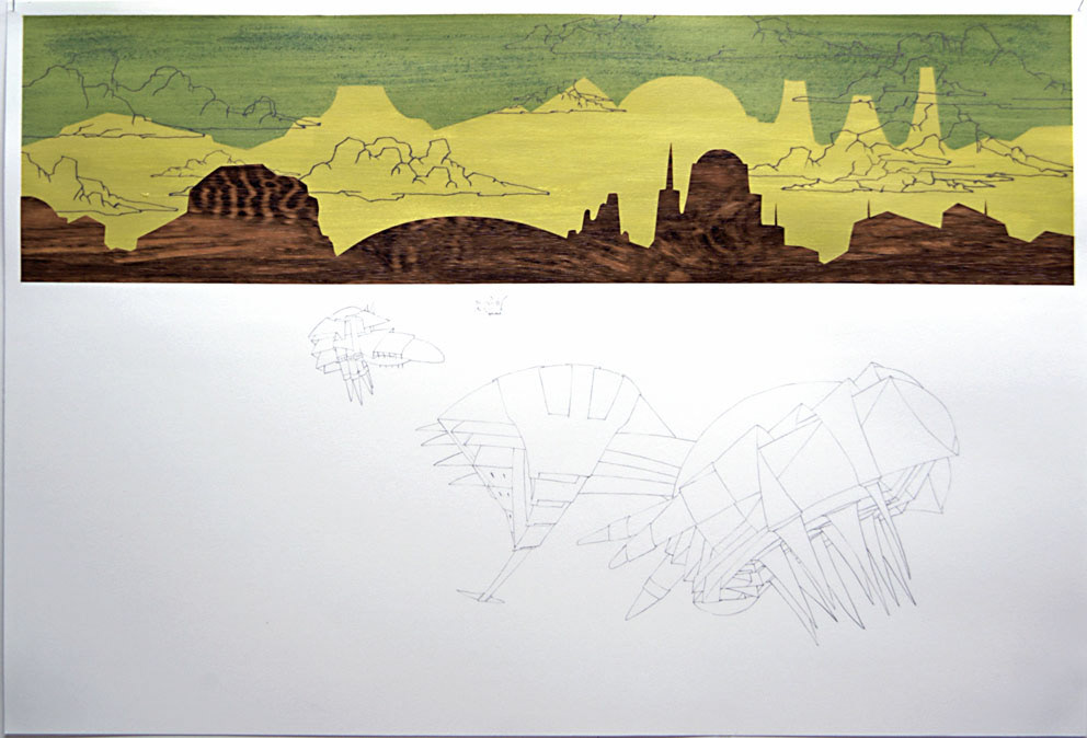 Sketch, acrylic paint, woodcut, 10x22cm to 44x77cm, 2003-2009 Investigating a mythological landscape